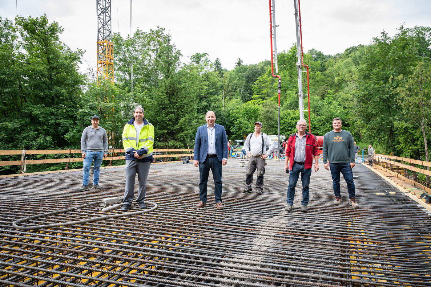 „Ein Brückenüberbau besteht aus der Fahrbahnplatte, den Hauptträgern samt Kragarmen und Querträgern. Der Überbau trägt die Lasten zu den Unterbauten mit den Widerlagern ab“, erklärt Tiefbauamtsleiter Timo Geiger. Bevor die Firma Stotz mit den Betonierarbeiten loslegen konnte, wurde ein Schalungsgerüst aus Holz auf einer Stahlkonstruktion aufgebaut. Hierzu wurden 1.800 laufende Meter Bauholz verbaut und im Anschluss 65 Tonnen Baustahl verlegt. Zusatz-Info für Fans des Testturms und der Fußgänger-Hängebrücke: Der Bewehrungsstahl wurde von der Firma Eberhardt verbaut, die bereits beim Testturm aktiv war und nun als Bauherr für die geplante Fußgänger-Hängebrücke verantwortlich zeichnet. Von beiden Neckarufern pumpten LKW mit Schwenkarmen rund 200 Kubikmeter Beton in das Brückenbauwerk – ein eindrucksvoller Moment, den der Rottweiler Fotograf Ralf Graner für die Stadt Rottweil in Bildern festgehalten hat. „Wir sind froh, dass es mit der Brücke Stück für Stück vorangehen und ein Ende der Bauarbeiten absehbar ist. Mit dem Ersatzneubau stellen wir die Grundlage für eine bessere Anbindung des Gewerbeparks Neckartal über das Berner Feld her, was künftig auch die Innenstadt entlasten wird“, so Bürgermeister Dr. Christian Ruf, der sich vor Ort ein Bild vom Baufortschritt machte. Läuft weiterhin alles nach Plan, soll die Brücke im Herbst für den Verkehr frei gegeben werden. Bis dorthin gibt es für die Bauarbeiter aber noch einiges zu tun: Sobald der Stahlbeton ausgehärtet ist, müssen die Rampen, die Fahrbahn und weitere Aufbauten wie etwa die Geländer hergestellt werden.