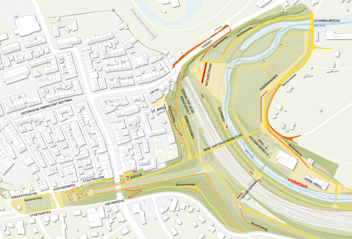Die Karte zeigt das Kerngelände der Landesgartenschau (Änderungen vorbehalten: Planungsstand April 2023, wird noch weiter ausgebarbeitet) gelb= Gefälle bis 5 Prozent, hellorange= Gefälle zwischen 5 und 10 Prozent, dunkelorange = Gefälle über 10 Prozent, rot = Treppen. Trampelpfade sind gestrichelt (Grafik: Stadt Rottweil).