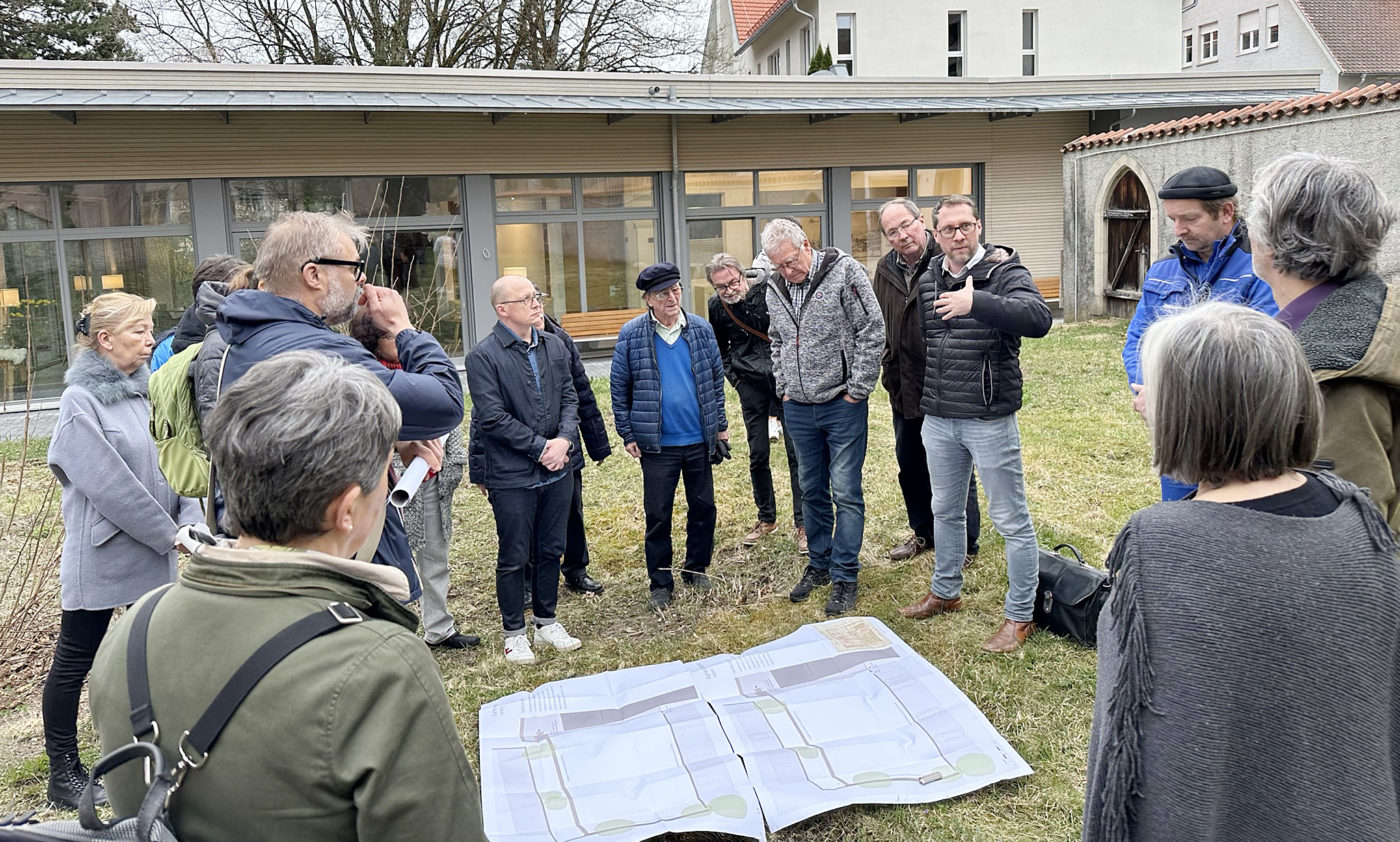 Ein wichtiger Punkt war auch die Umgestaltung des Kameralamtsgartens in einen „Bürgergarten“. „Das ist ihr Garten, hier dürfen sie ebenfalls mitentscheiden“, machte Micha Sonnenfroh, Abteilungsleiter Stadtgrün und Gewässer und Projektleiter der Landesgartenschau, deutlich. Der Kameralamtsgarten soll nicht als Schaugarten für die Landesgartenschau im Jahr 2028 dienen, sondern vielmehr für die Anwohner Aufenthaltsmöglichkeiten bieten. Mit der Gestaltung soll bereits ab diesem Sommer begonnen werden. Sowohl der obere, als auch der untere Bereich des Kameralamtsgartens, der noch dem Land gehört, sollen neu gestaltet werden, so Sonnenfroh. Landschaftsarchitekt Harald Sailer stellte anhand von Plänen mögliche Gestaltungen des oberen Bereichs vor, und die Bürger brachten zahlreiche Ideen mit ein. So waren beispielsweise beim Quartiersgespräch zwei Gestaltungsvarianten angesprochen worden. Eine moderne mit einer großen multifunktionalen Grünfläche, festen und frei bewegbaren Möbeln, Platzhalter für Kunst und schattenspendenden Bäumen – und eine Gestaltung in Anlehnung an die historische Vorlage aus dem Jahr 1798. Die moderne Variante machte nun beim Ortstermin das Rennen. Wichtig für den Bürgergarten sei, dass er Aufenthaltsmöglichkeiten und Spielmöglichkeiten (keinen Spielplatz), biete, und dass man diesen abends abschließen könne. In Richtung Hotel soll es eine optische Abgrenzung geben und einen möglichst barrierefreien Übergang in den unteren Bereich. Harald Sailer zeichnete die Vorschläge in den Plan ein, der im Anschluss ausgearbeitet und den Bürgern erneut vorgestellt werden soll. Im Sommer solle es mit den ersten Arbeiten loslegen.