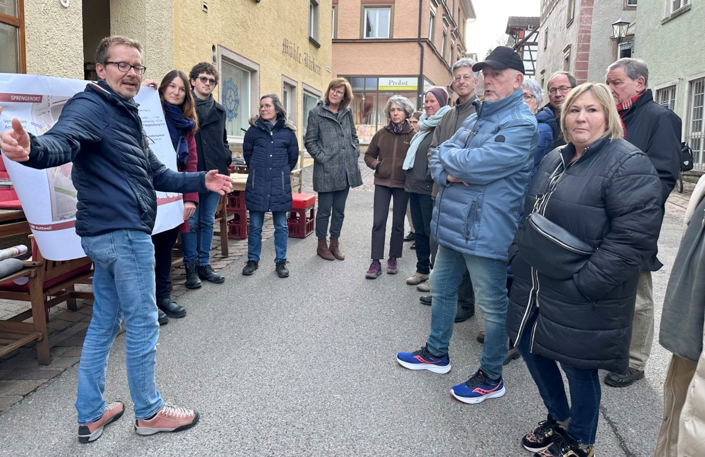 Wie dringlich es ist, die Verkehrsführung in den Quartieren nicht nur neu zu überdenken, sondern auch neu zu lenken, das zeigten gleich mehrere Negativbeispiele: Während des Rundgangs durch den Sprengerort fuhr ein Auto in die Fußgängerzone und zwei entgegen der Einbahnstraße in der Suppengasse. Zudem musste die Gruppe, die sich um den städtischen Mobilitätsexperten Horst Bisinger, Innenstadtmanagerin Kerstin Ohnmacht und Simone Strasser vom Stadtmarketing zum Rundgang getroffen hatte, gleich mehrfach durchfahrenden Autos weichen. „Das ist Alltag hier“, wusste ein Anwohner zu berichten. „Dieser Abkürzungsverkehr nervt fürchterlich“, ergänzte eine Anwohnerin. Eine Idee von einer Anwohnerin war, nur noch Anlieger in die Quartiere zu lassen und anderen Verkehrsteilnehmern die Zufahrt per Poller zu verwehren.