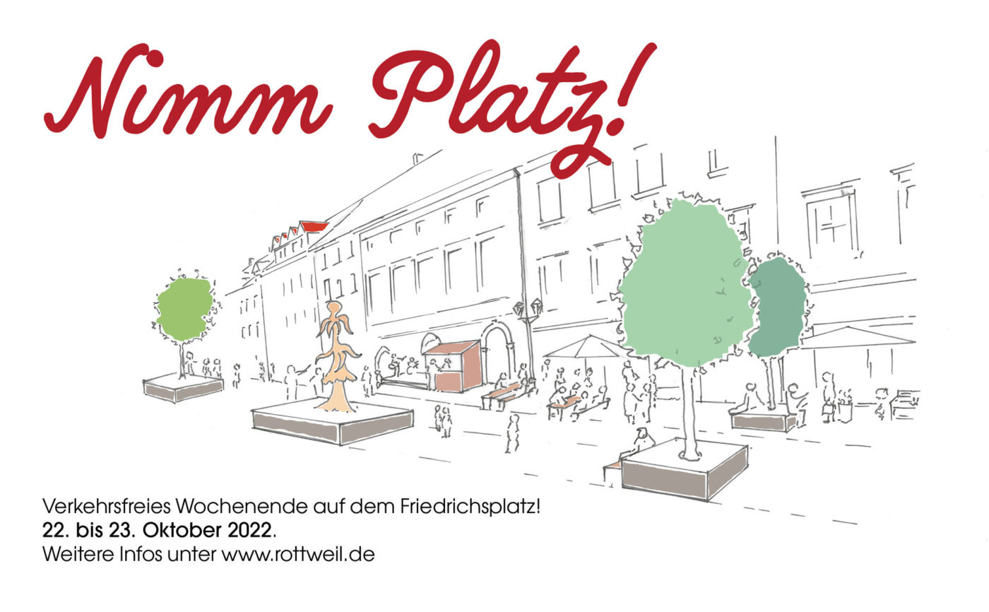 Einen Vorgeschmack auf eine verkehrsberuhigte Innenstadt bekommen Rottweils Bürgerinnen und Bürger sowie Gäste am Samstag, 22. und Sonntag, 23. Oktober: Unter dem Motto „Nimm Platz“ wird der Friedrichsplatz testweise zur autofreien Zone. Statt Verkehrslärm gibt es ein buntes Programm mit Biergartenatmosphäre, Musik und Angeboten für Kinder. Highlight der Aktion ist die Aufstellung eines weiteren Kunstobjektes aus der Serie „PLATZHALTER“ in Zusammenarbeit mit Forum Kunst. Einen Tag später locken zudem der Volksbanklauf und der verkaufsoffenen Sonntag des Gewerbe- und Handelsvereins (GHV) ins Städtle – beides nochmals ein guter Anlass, den Friedrichsplatz von einer ganz anderen Seite zu erleben.